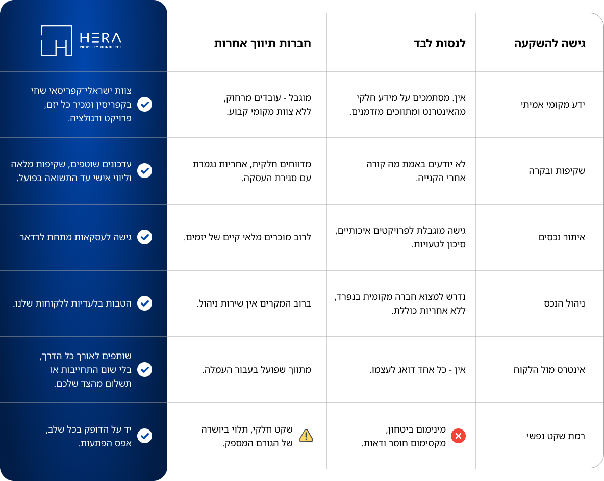 צוות Hera דואג לכל הפרטים: חוזים, רישום, בנקים ומיסוי.